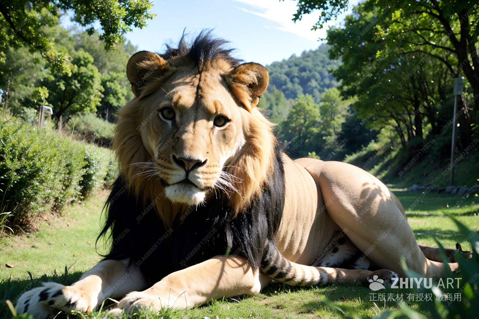 一只雄伟的狮子,全身覆盖着引人注目的黑红色条纹皮毛