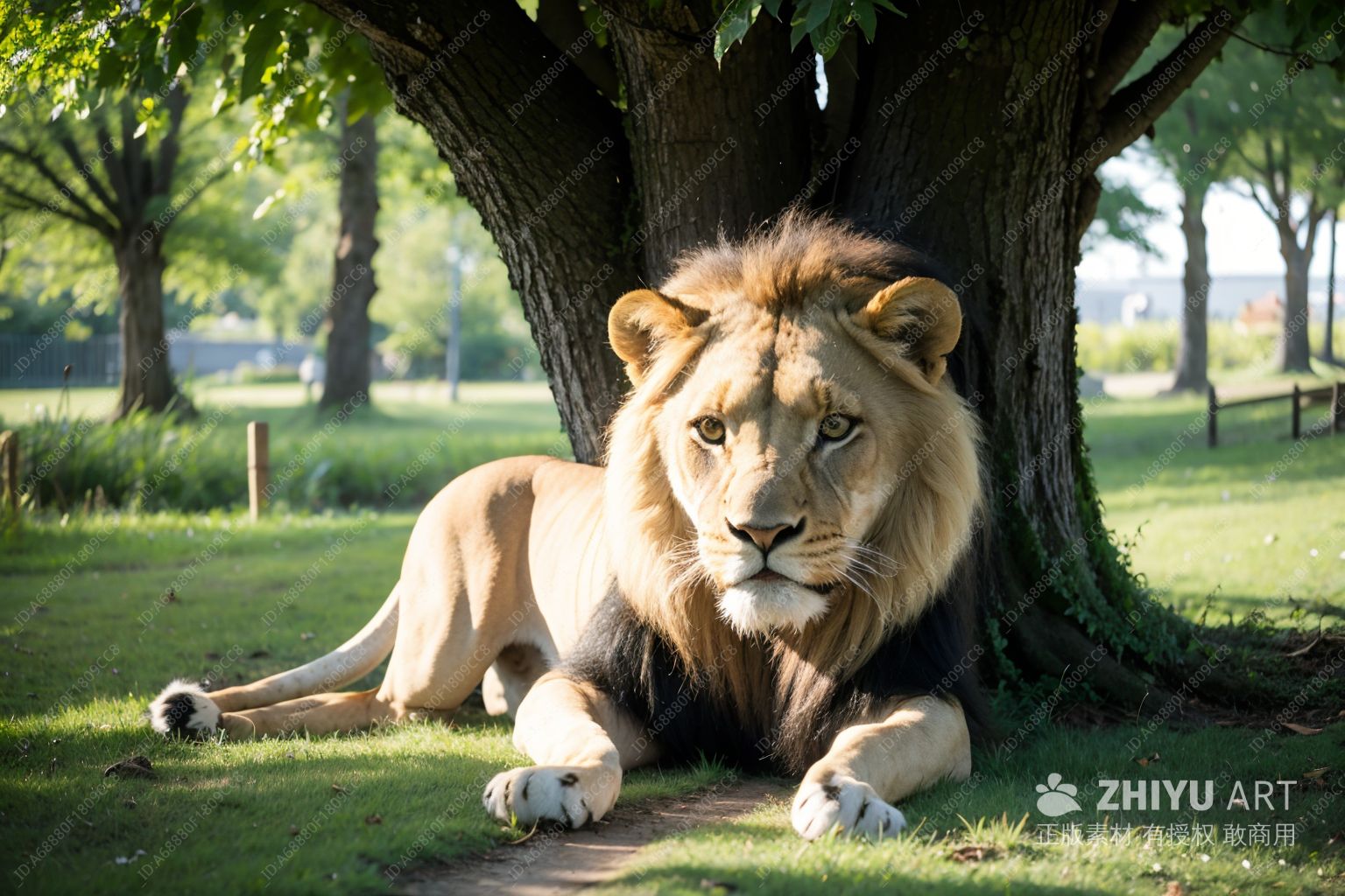 茂密的、热带雨林中,一只雄伟的狮子懒洋洋地躺在树枝