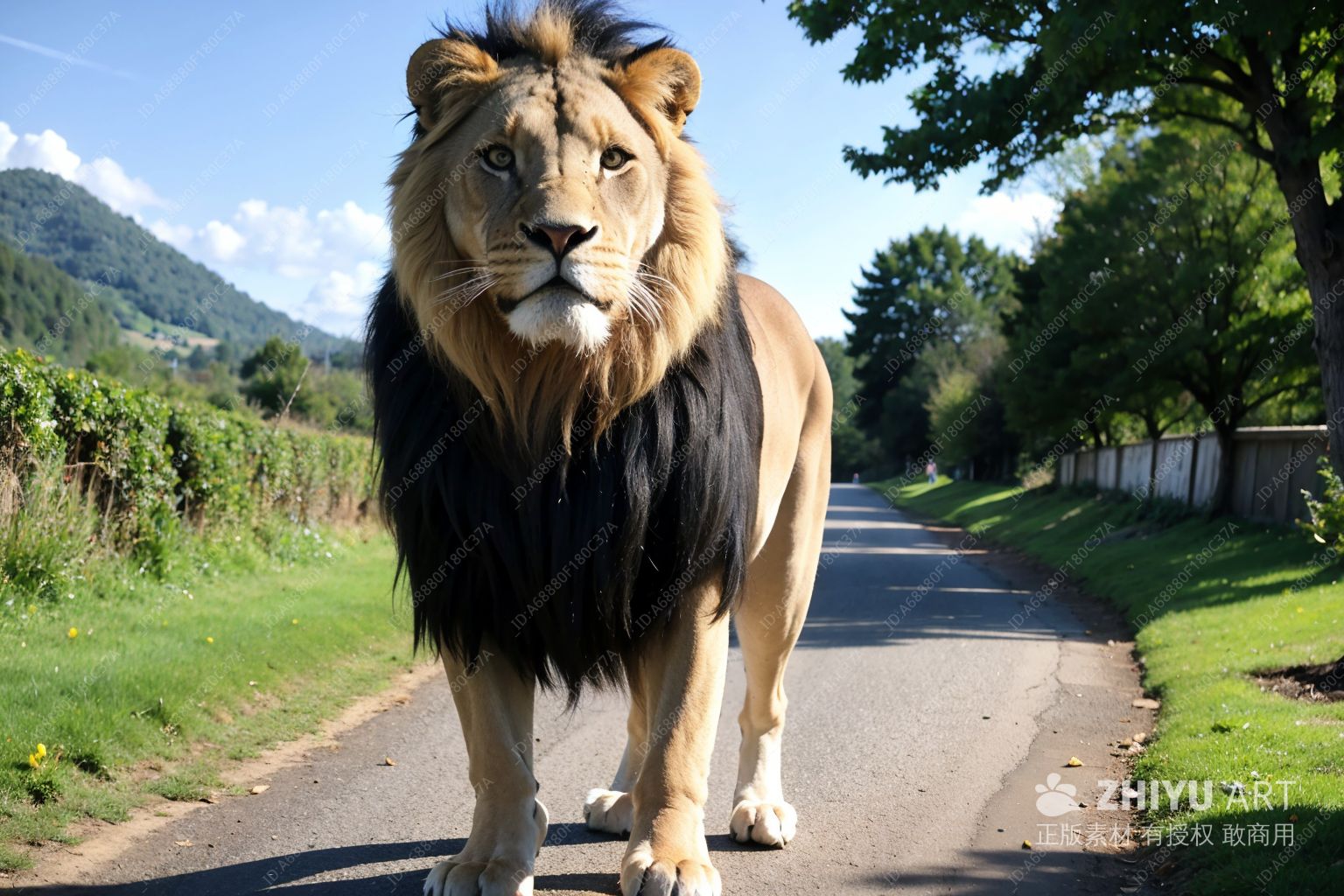 一只雄狮正朝向画面走来,它拥有蓬松且发光的鬃毛,眼