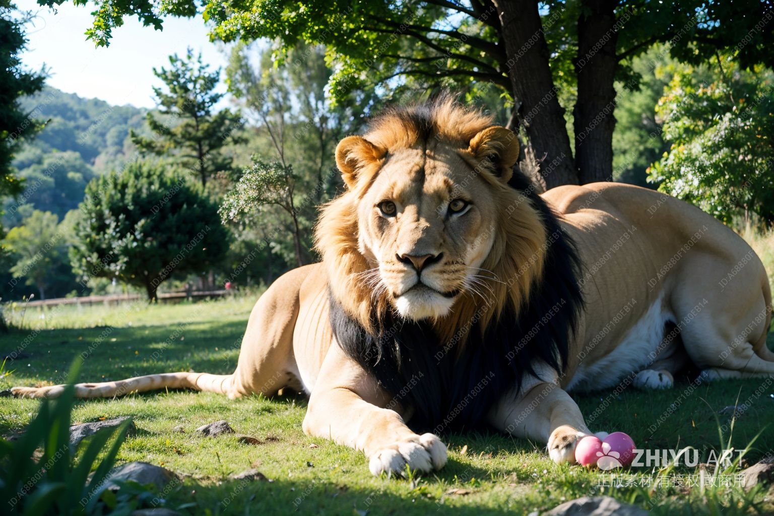 一只雄伟的狮子,全身覆盖着引人注目的黑红色条纹皮毛