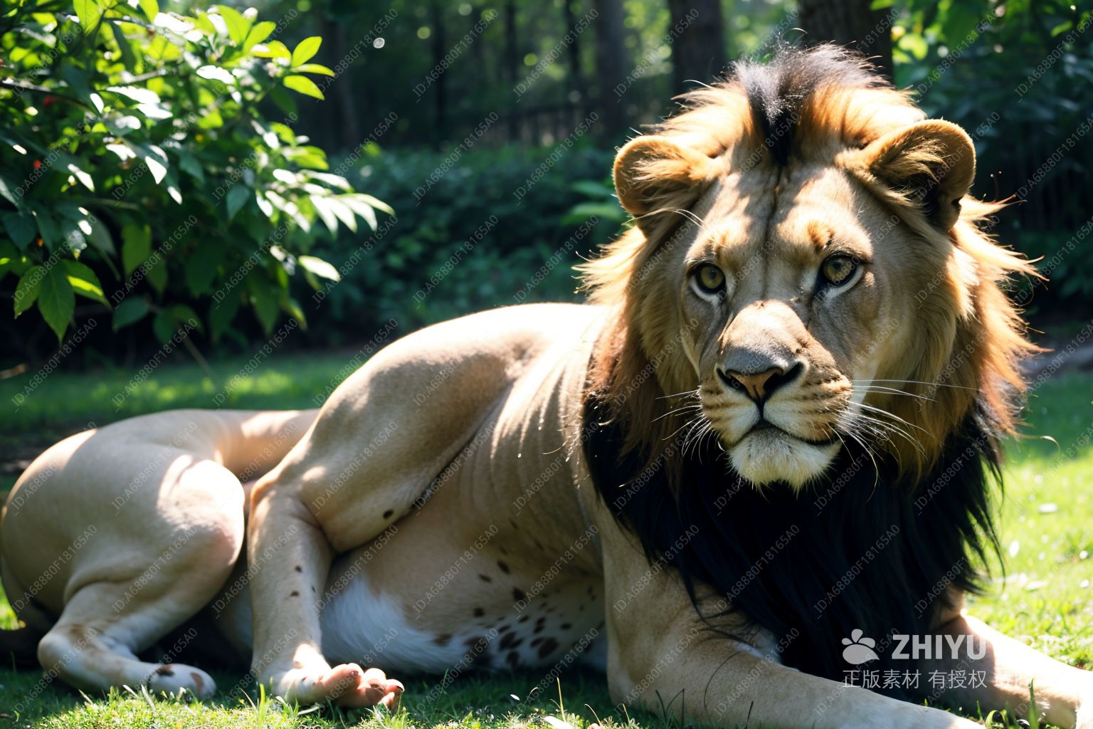 茂密的、热带雨林中,一只雄伟的狮子懒洋洋地躺在树枝