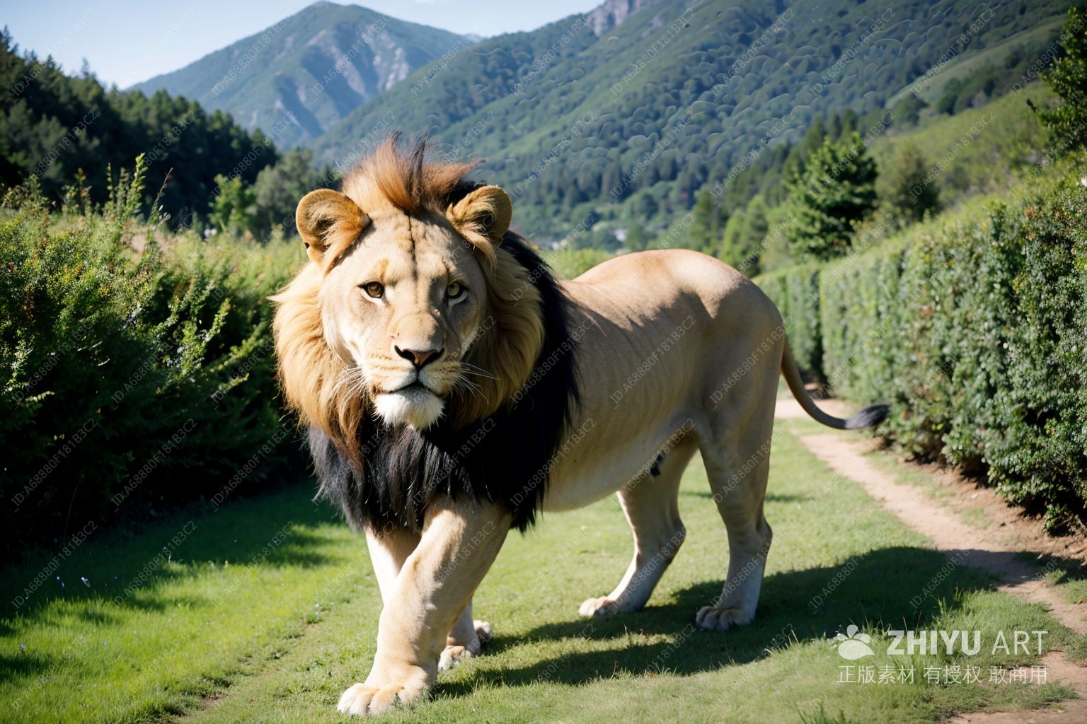 一只雄狮正朝向画面走来,它拥有蓬松且发光的鬃毛,眼