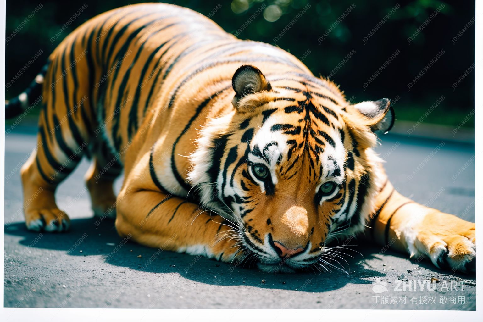 一只老虎位于画面中央,它的皮毛呈橙色和黑色条纹相间