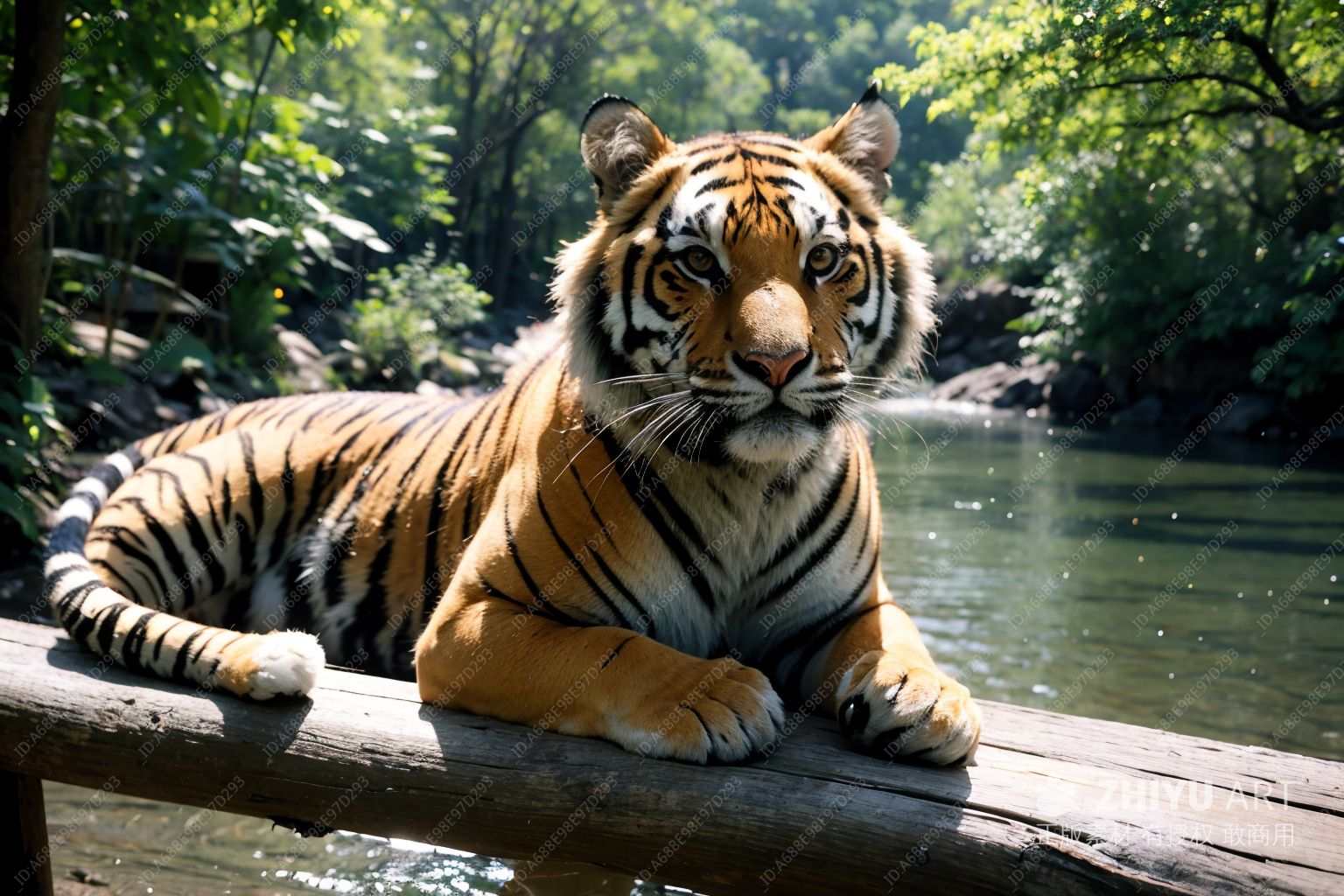 一只老虎卧在树干上,树干上缠绕着蜘蛛网。老虎的背景