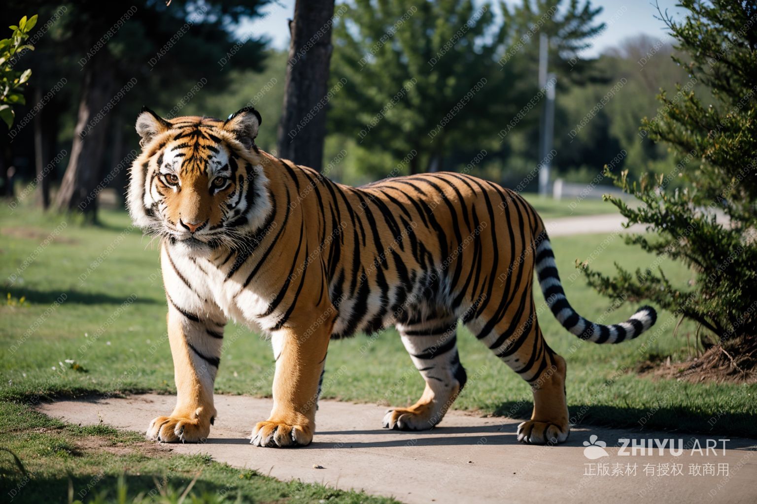 一只老虎位于画面中央,它的皮毛呈橙色和黑色条纹相间