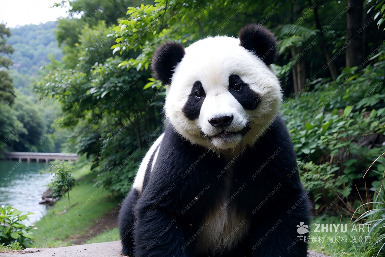 一片奇特的森林场景,熊猫的背上堆叠着紫色的洋蓟。咧