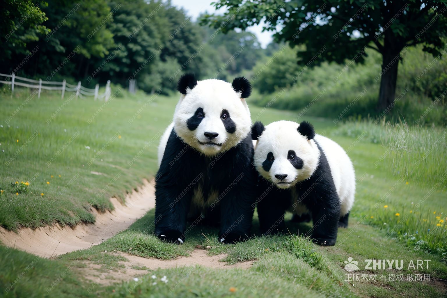 一片奇特的森林场景,熊猫的背上堆叠着紫色的洋蓟。咧