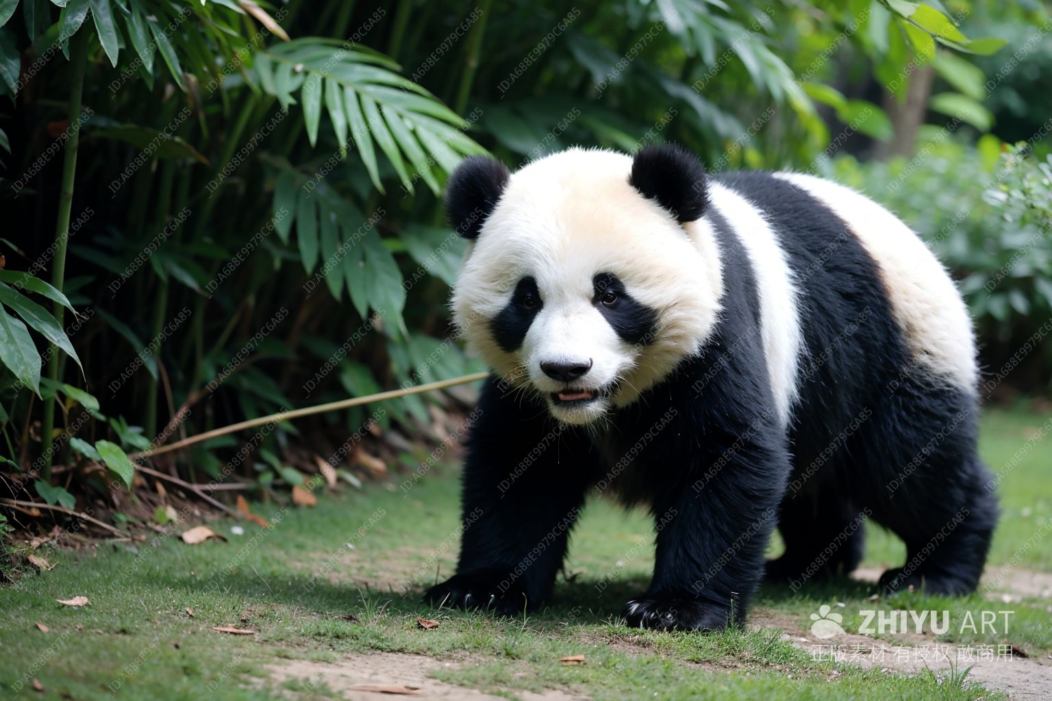 一片奇特的森林场景,熊猫的背上堆叠着紫色的洋蓟。咧