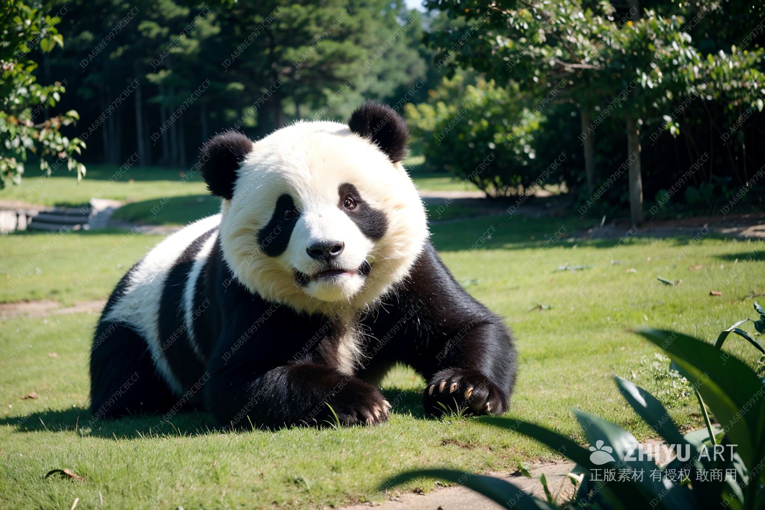 一只熊猫四肢舒展开,躺在翠绿的草地上,周围散落着几