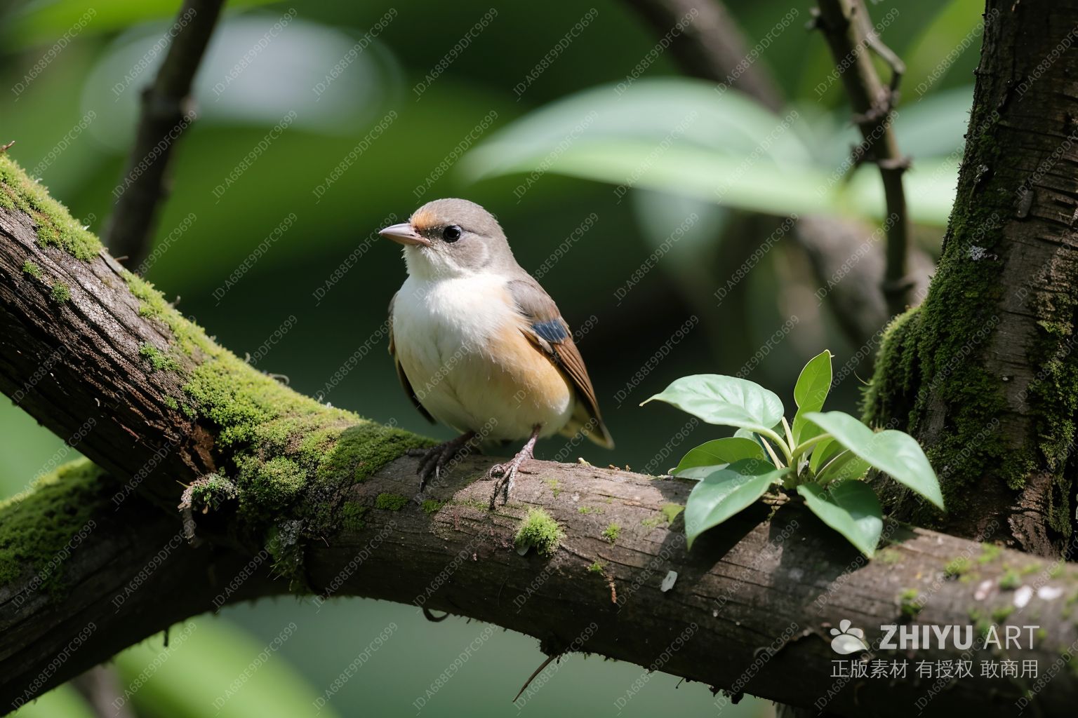 一只小鸟栖息在树枝上,它的翅膀微微张开。小鸟的羽毛