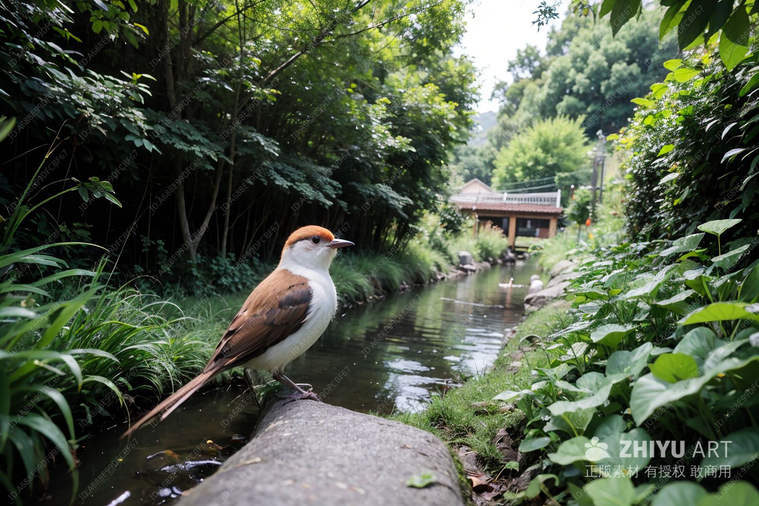一只小鸟栖息在树枝上,背景是绿叶和一些圆形光晕。小