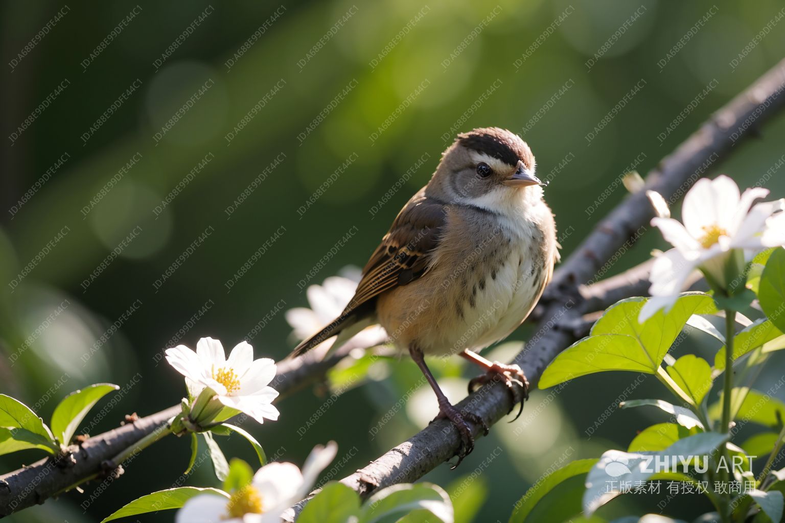 一只色彩鲜艳的鸟栖息在开满鲜花的树枝上,背景是晴朗