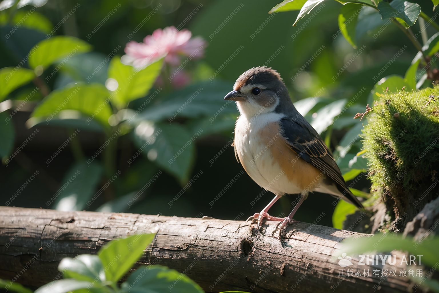 一只小鸟栖息在树枝上,周围是花园。花园里有各种颜色