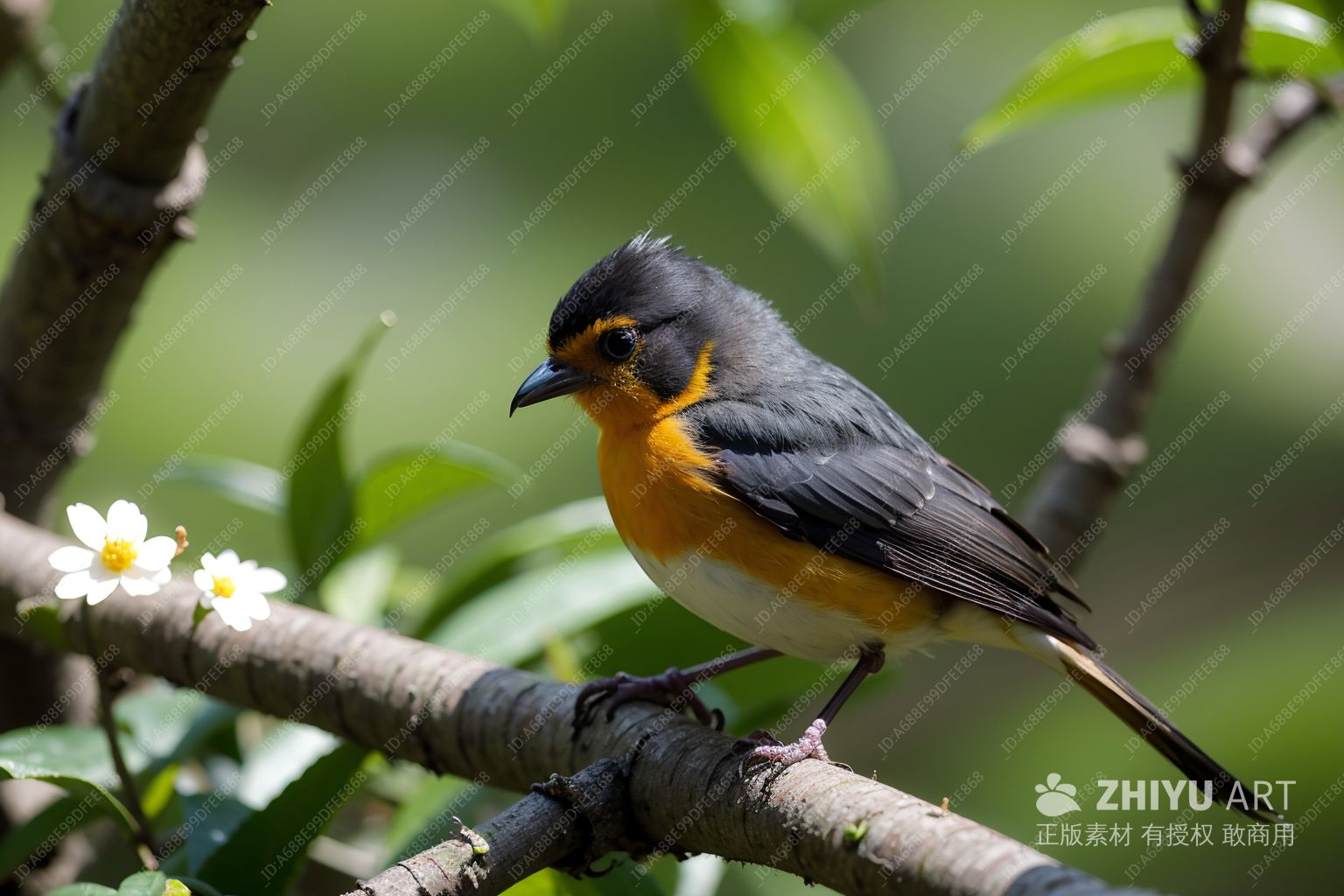 一只小鸟栖息在树枝上,背景是绿叶和一些圆形光晕。小