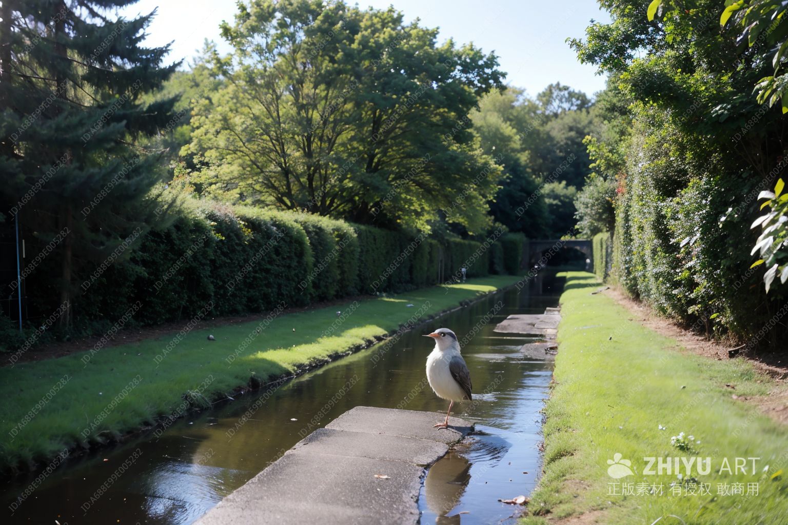 一只鸟站在树枝上,背景是绿色的树叶。这只鸟的羽毛是