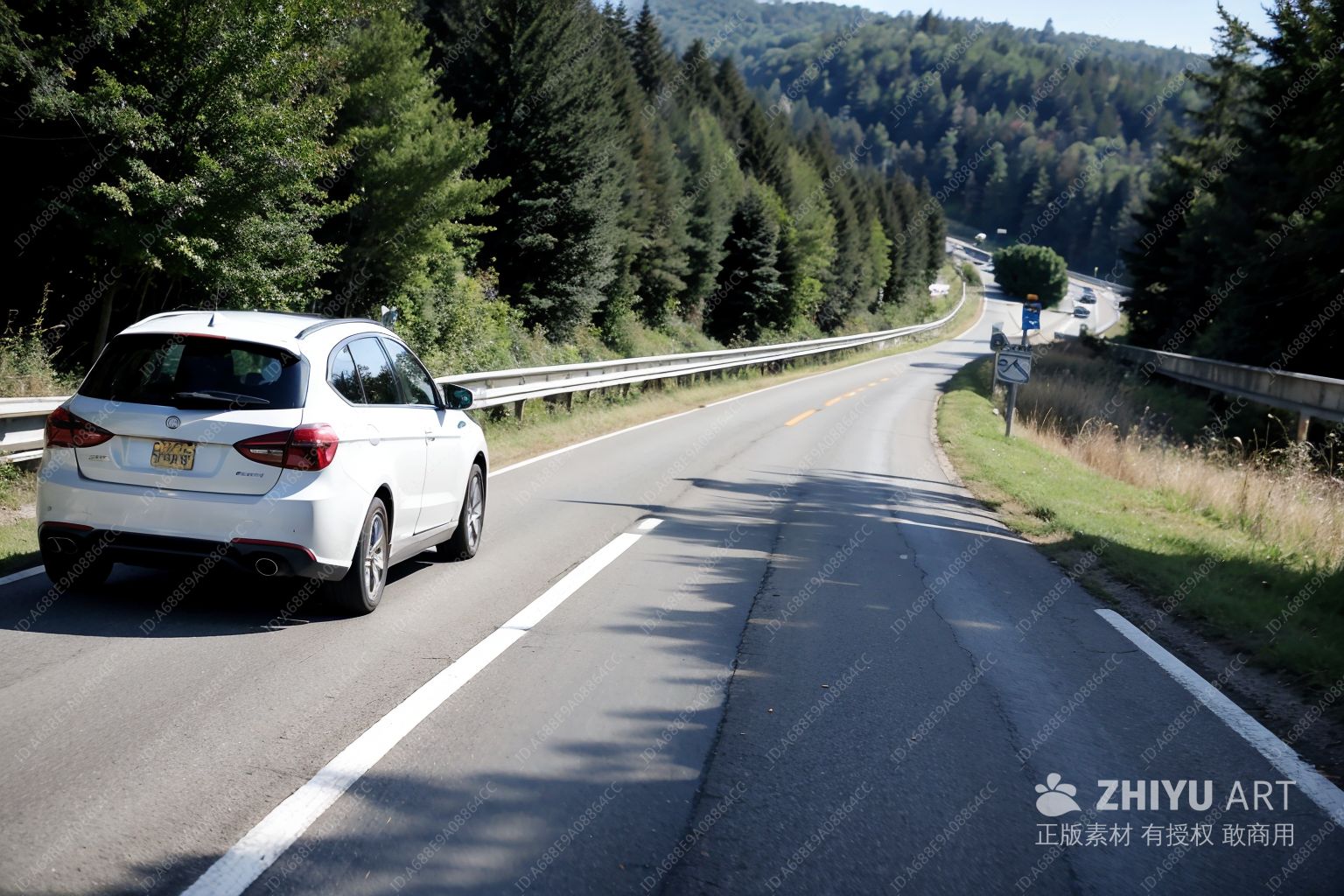 一辆汽车行驶在道路上,道路两旁是茂密的绿色森林。画