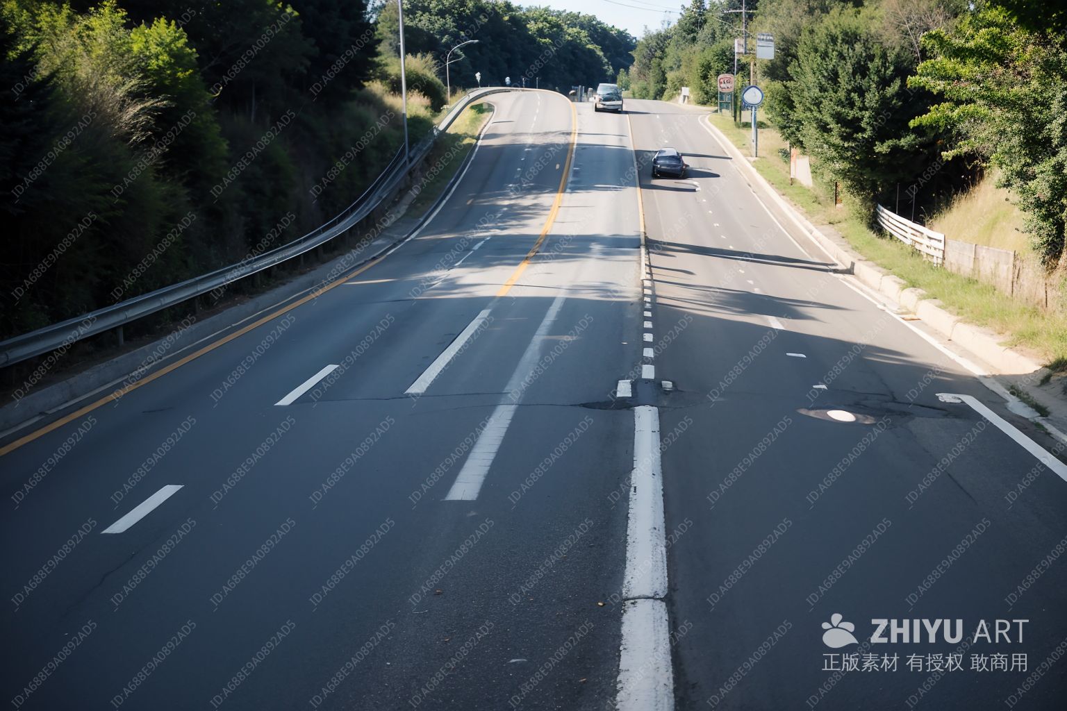 一条笔直的道路延伸向远方,道路中央有两条黄色实线,