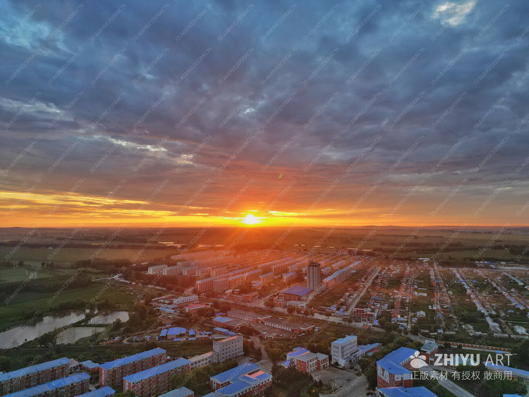 日出时分,天空像被打翻的调色盘,厚重的云层被染成橙红与紫灰,太阳如炽热的金球,在天际缓缓下沉,把阳光洒向大地。城镇的建筑错落有致,蓝色屋顶与暖黄的光影交融,河流如丝带蜿蜒,田野似绿色绒毯延展。这是自然与人间烟火的深情对话。