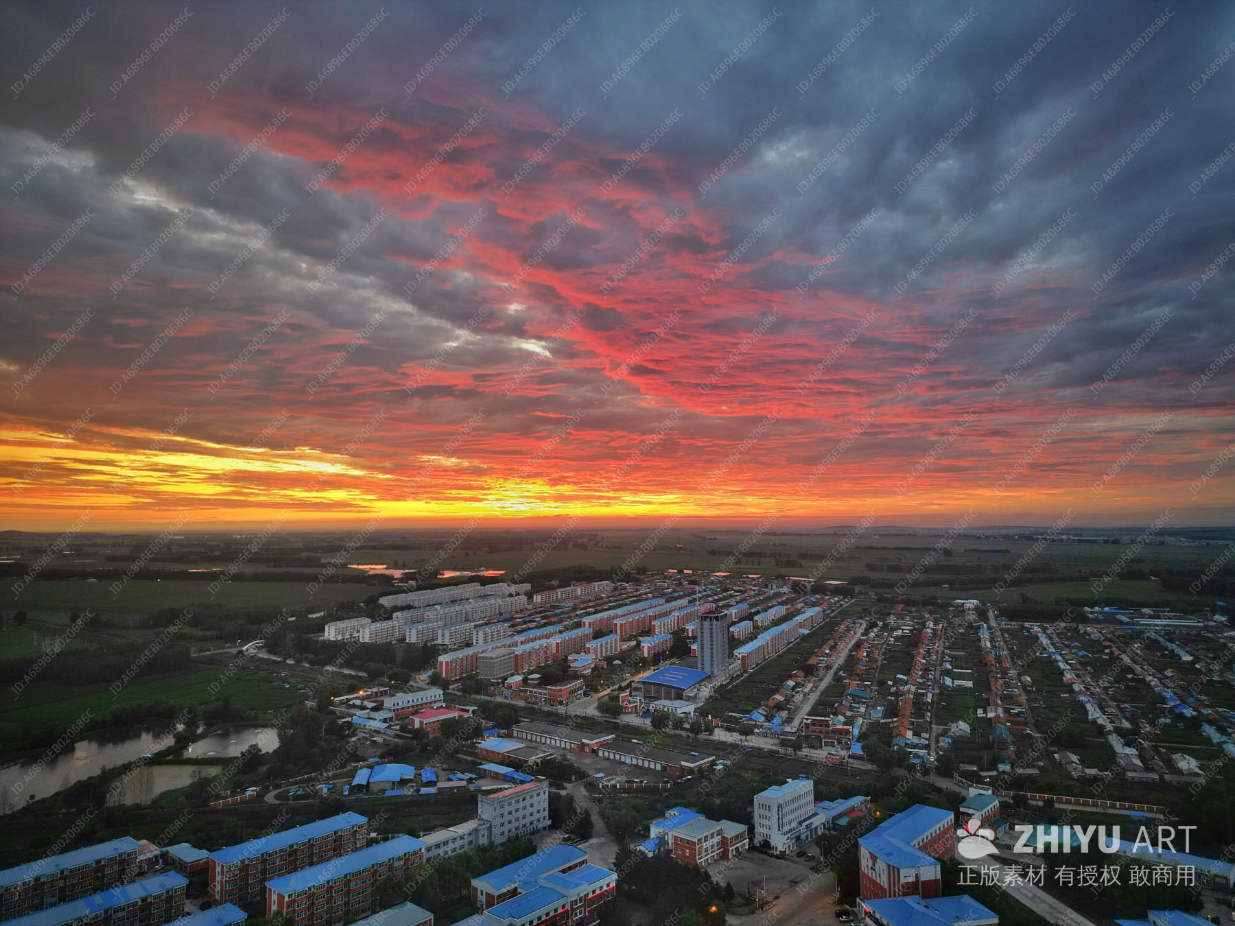 天空仿若被施了魔法,厚重的云层间,一道明艳的红霞如灵动的丝带穿梭,橙黄的翰阳在远方散发着温柔光晕,将天际晕染得层次万千。蓝顶建筑错落有致,河流似银带蜿蜒,田野如绿毯延展。这是朝霞写下的浪漫情书,每一抹色彩、每一处轮廓,都在诉说自然与人间的交融之美。