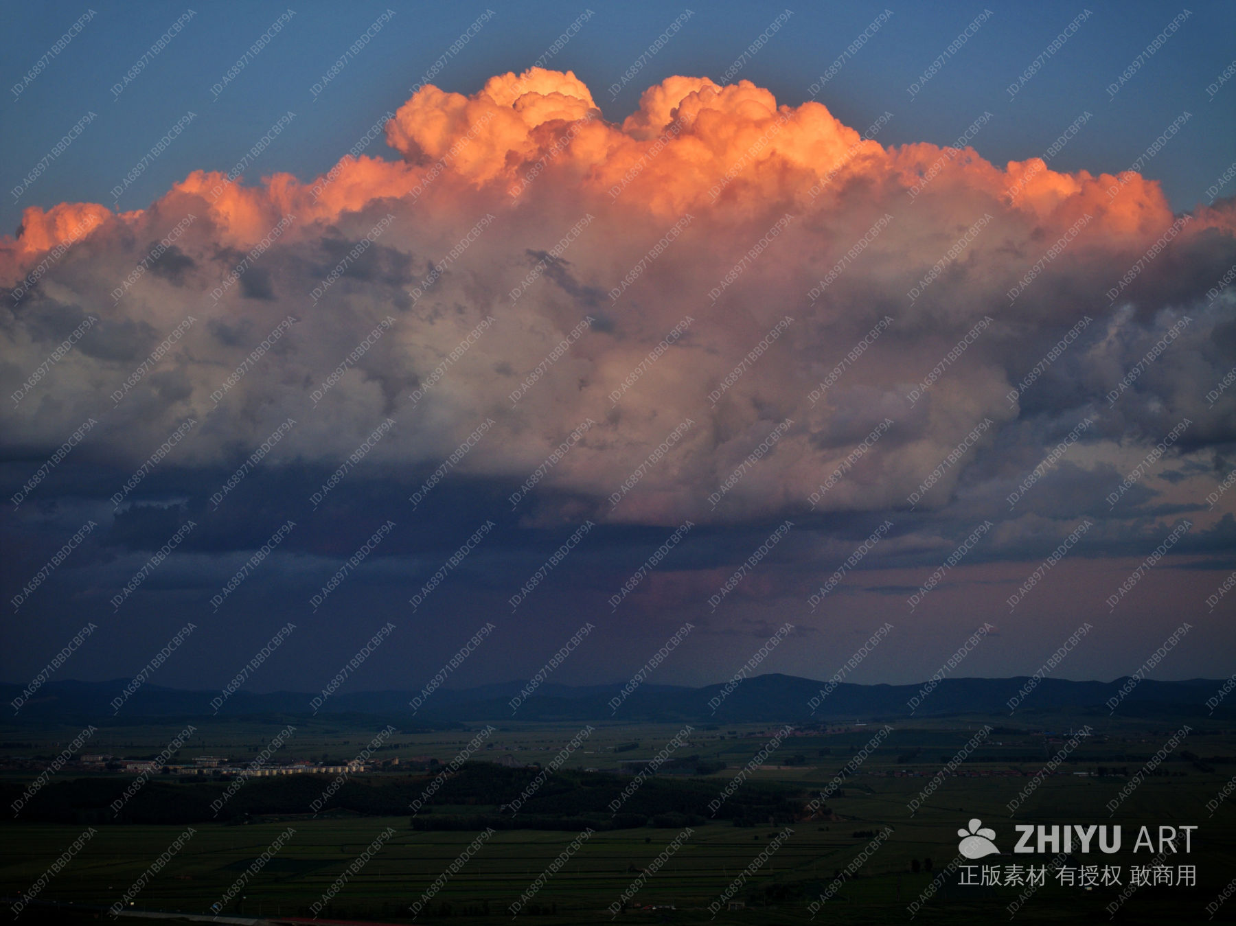 天空宛如一幅宏大的油画,厚重的云层堆叠,顶部被夕阳染成炽热的橙红,像是燃烧的火焰,而底部则是深沉的灰紫,似在孕育神秘。下方,广袤的大地在暮色中铺展,田野如绿色绒毯,山峦朦胧伫立,整个画面充满雄浑的静谧。