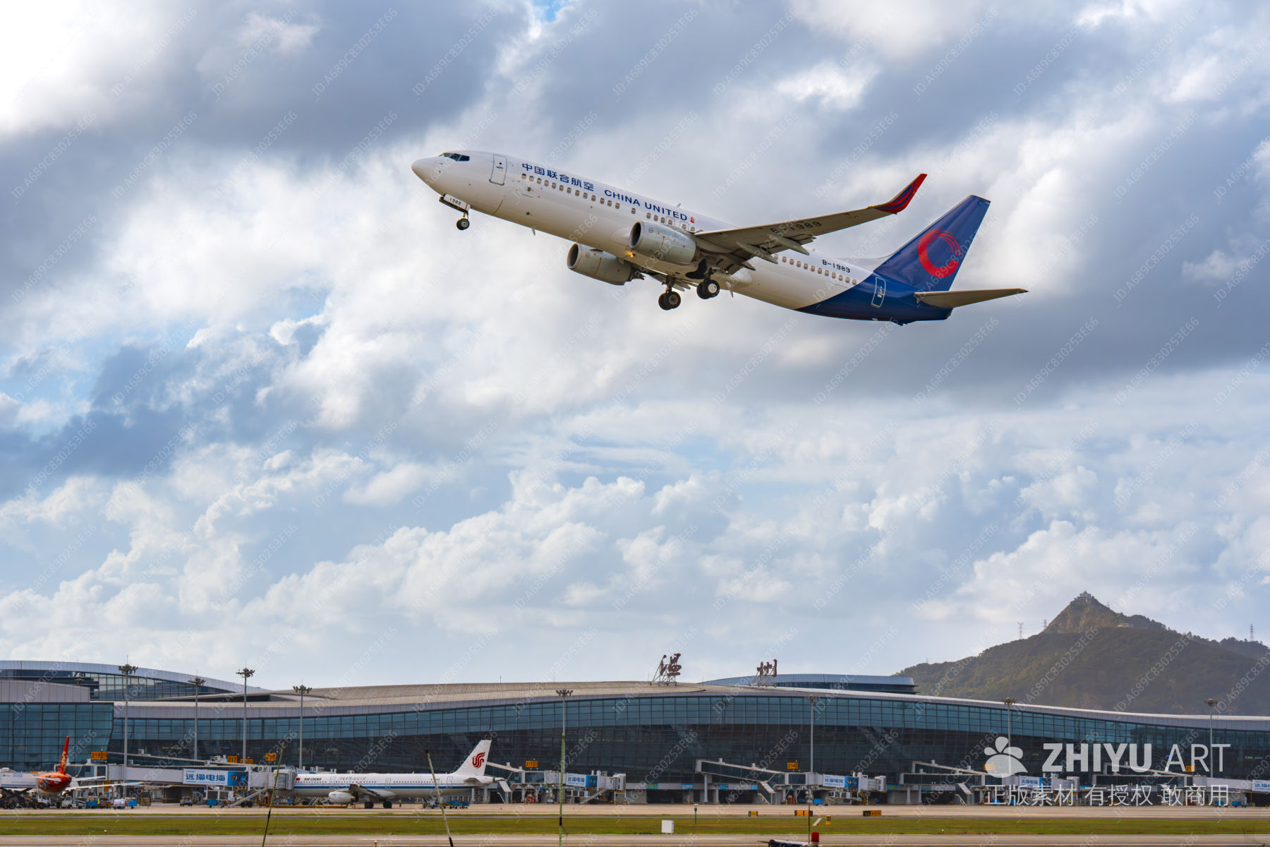 白云机场的蓝天白云与起飞飞机