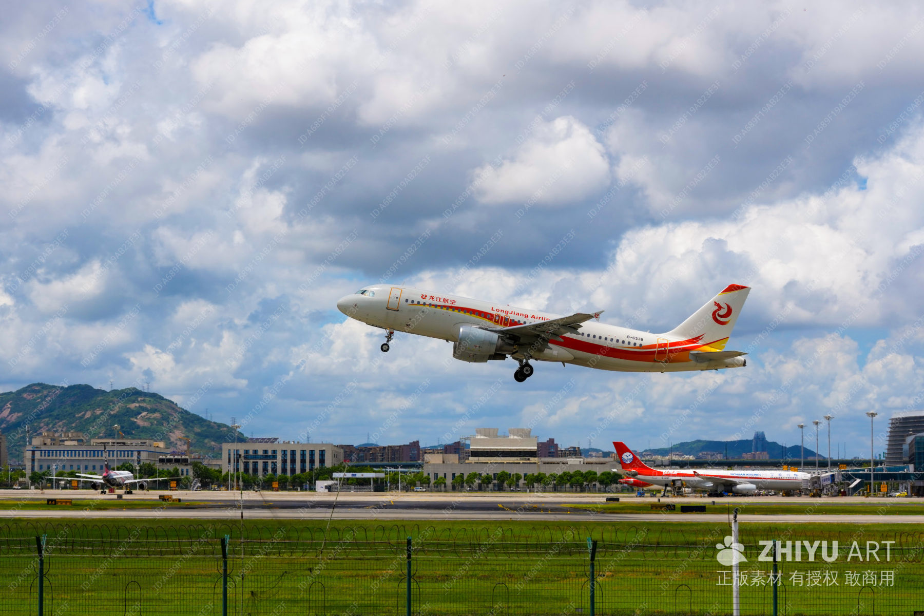 蓝天白云下的机场起飞