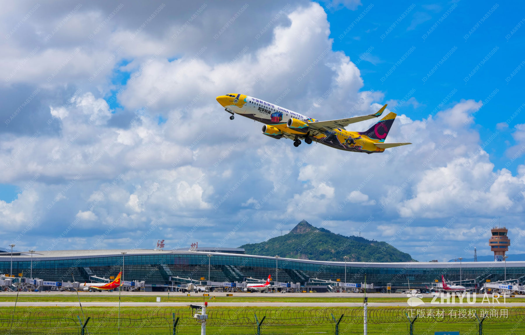中国联合航空彩绘飞机在机场起降