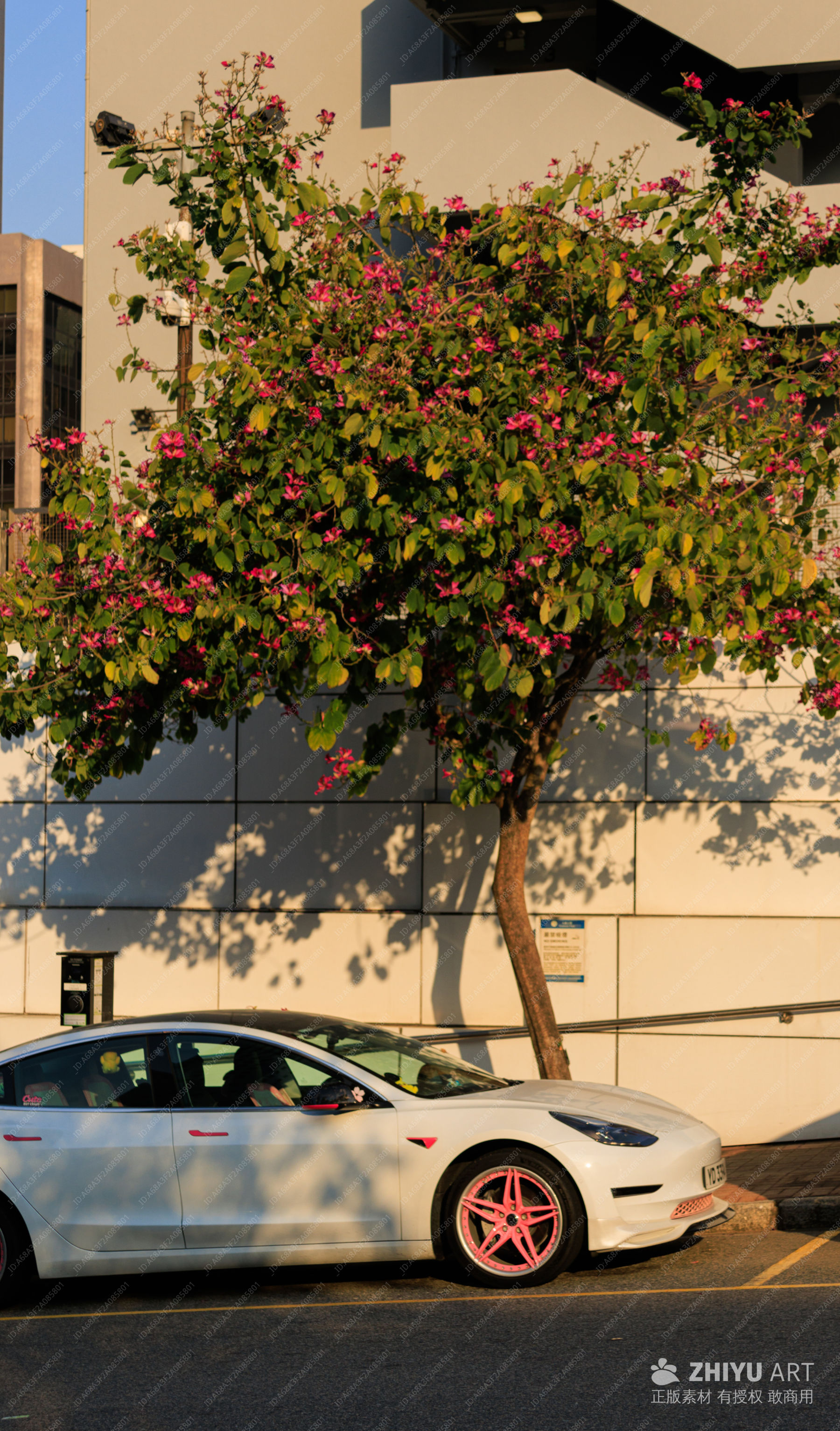 夕阳下的白色轿车