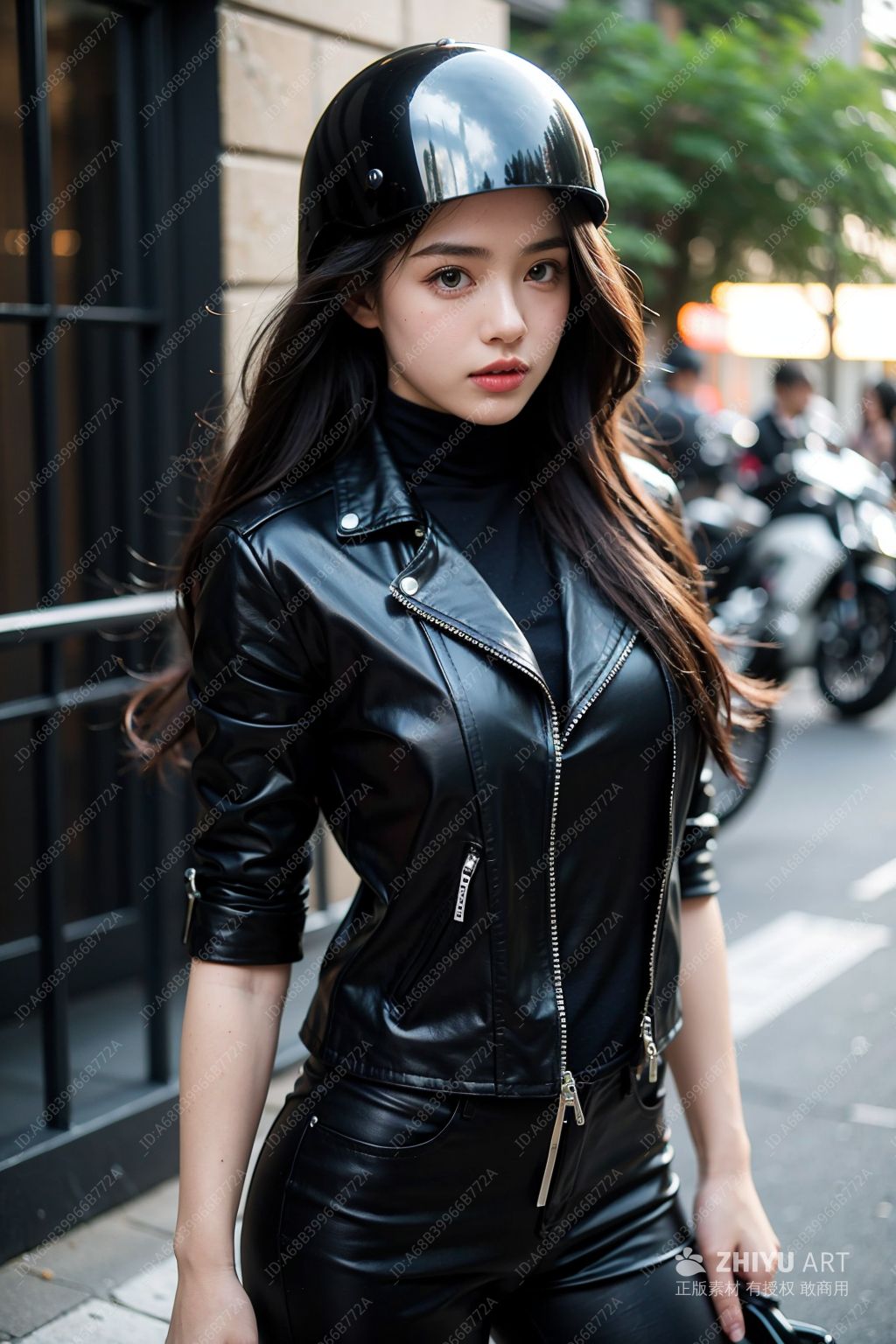 一位年轻女子站在城市道路上自拍。她穿着黑色皮夹克,