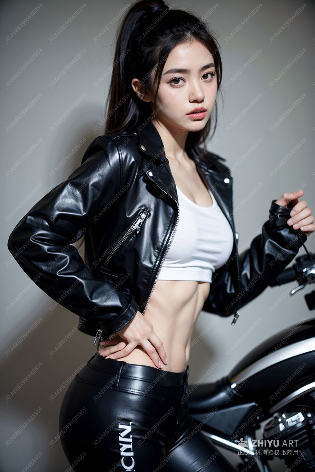 一位身穿黑色紧身衣的性感女性坐在发光的轻型摩托车上