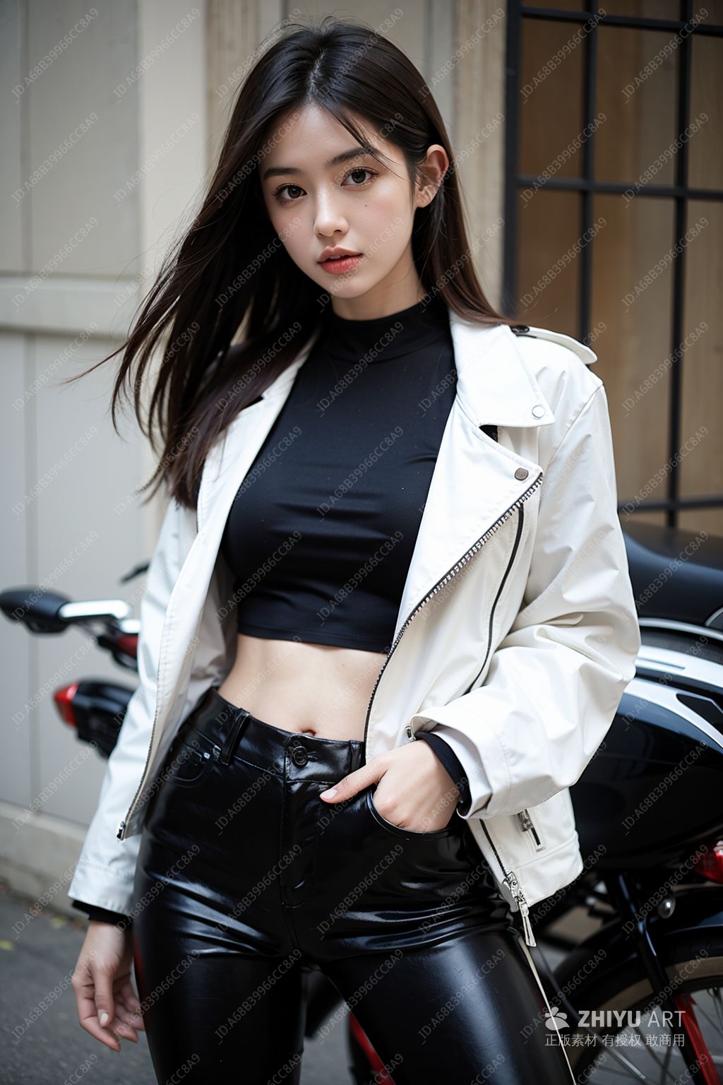 一位身穿黑色紧身衣的性感女性坐在发光的轻型摩托车上