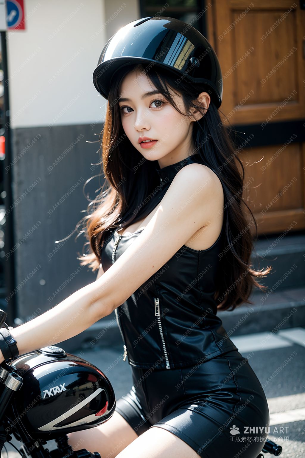 夜晚的街道上,一位年轻女子坐在黑色的摩托车上。摩托
