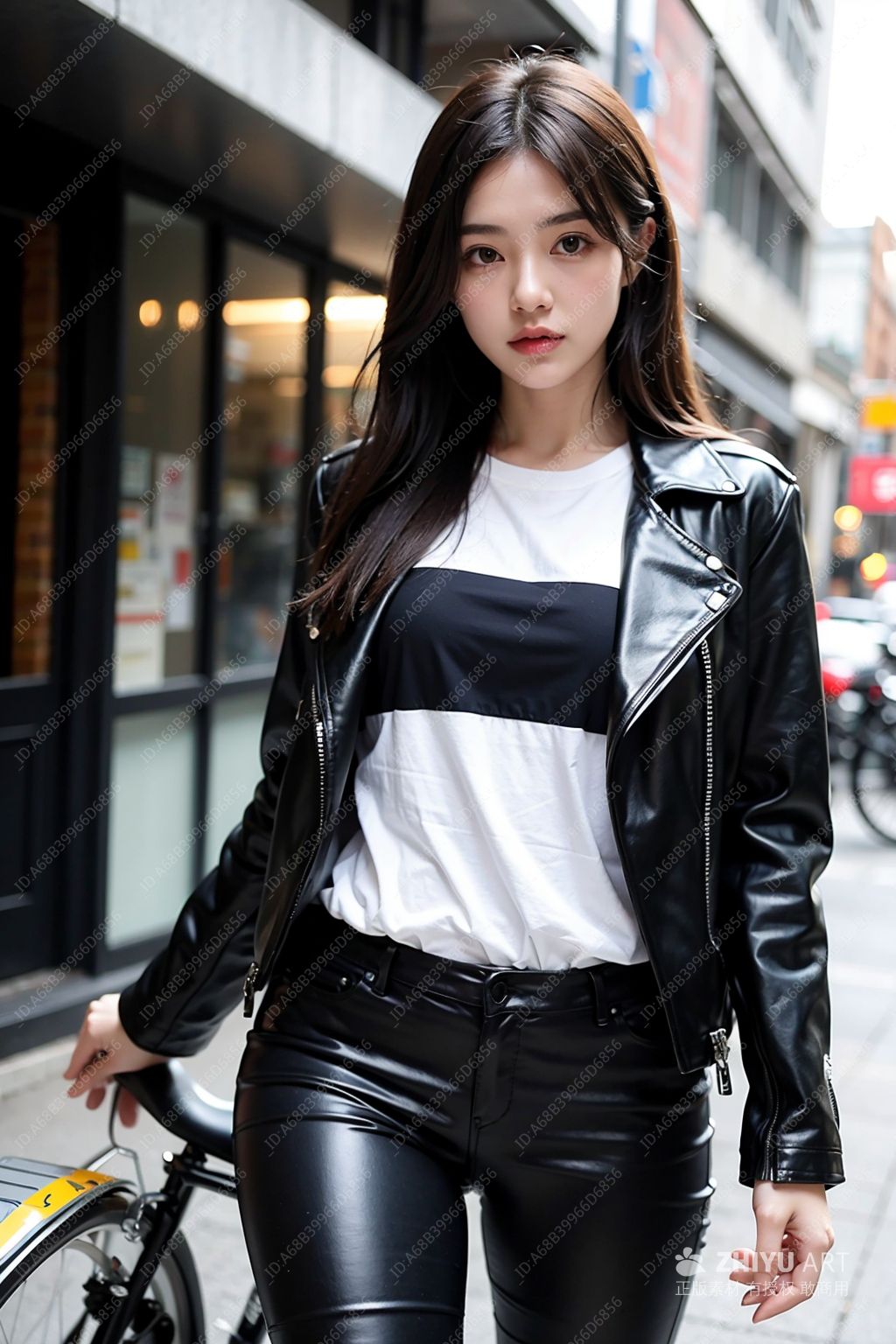 一位年轻女子站在城市道路上自拍。她穿着黑色皮夹克,