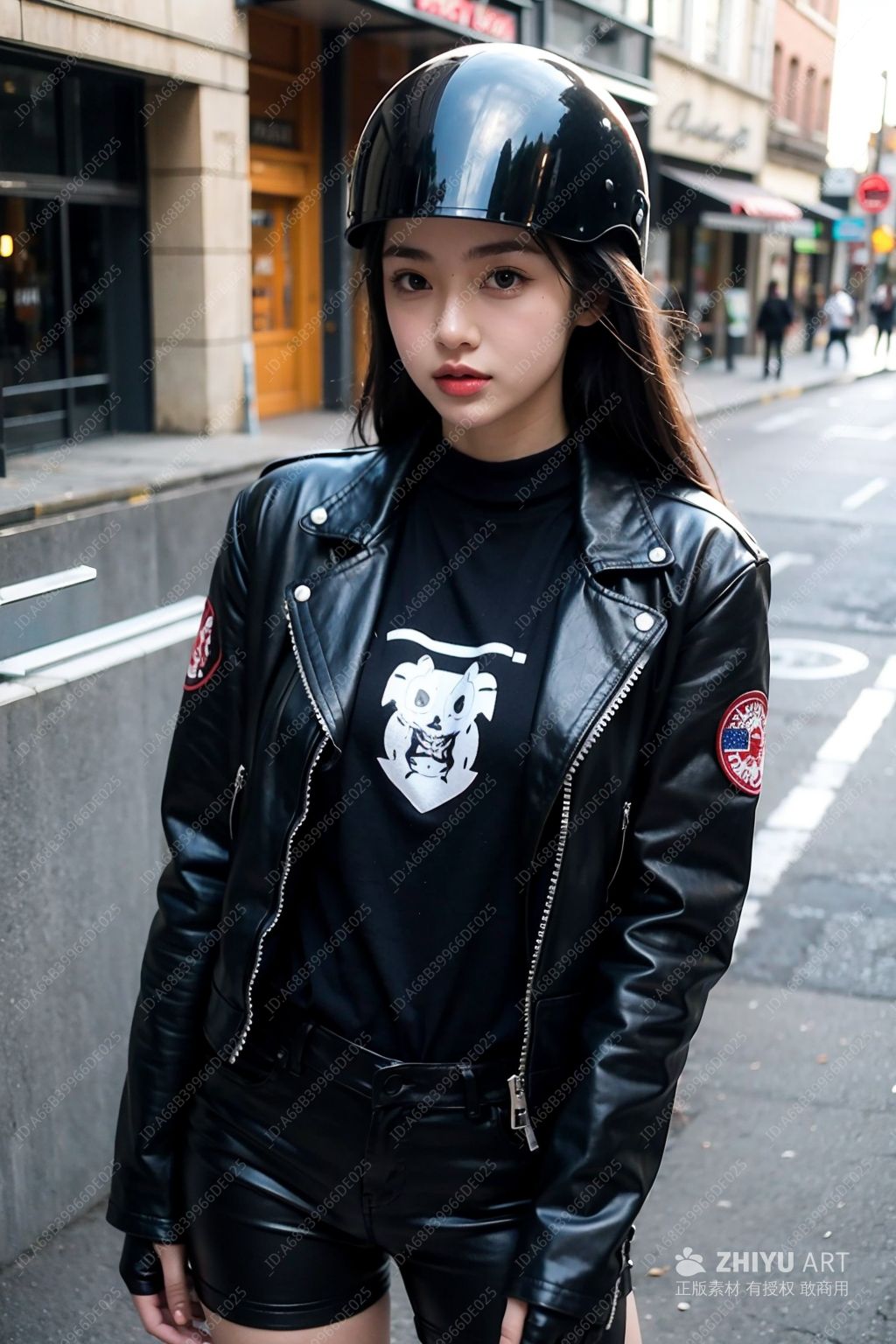 一位年轻女子站在城市道路上自拍。她穿着黑色皮夹克,