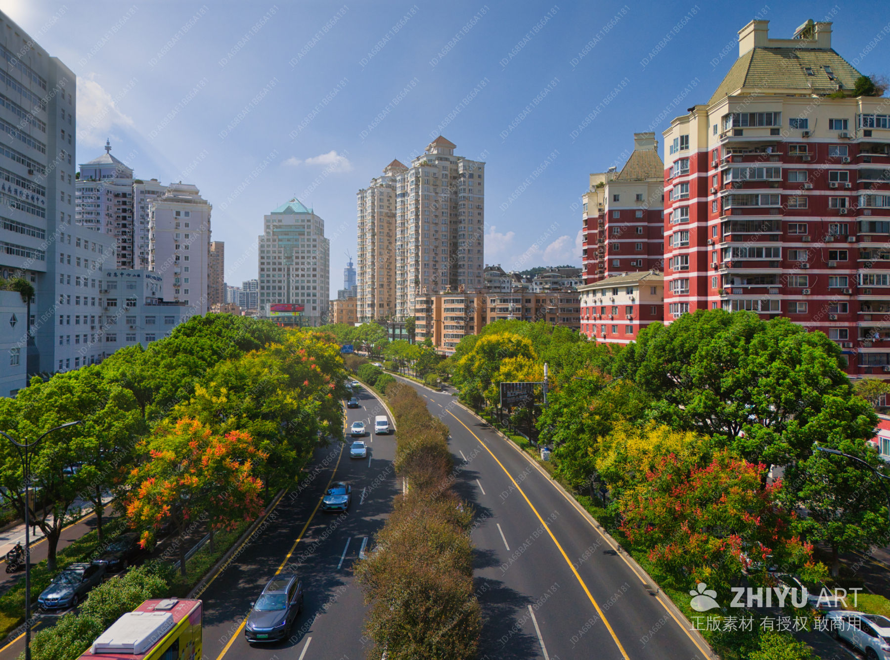都市街景:绿树与高楼的交响