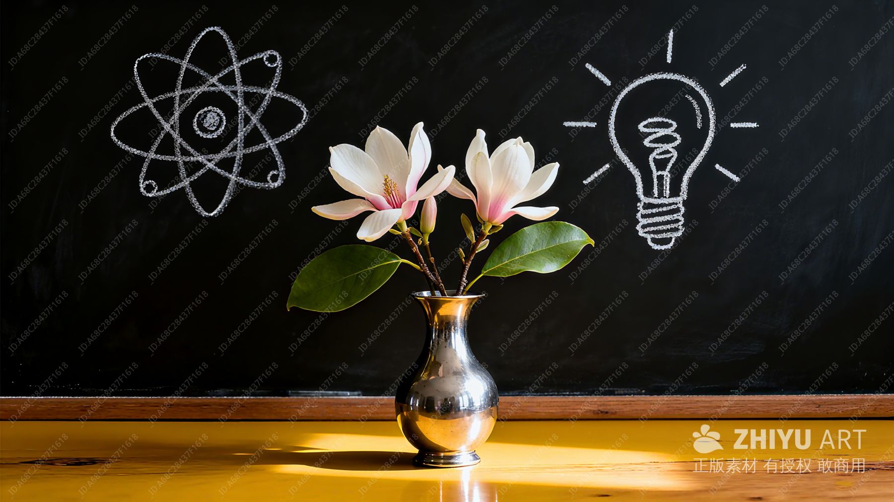 自然的花卉与象征科学与灵感的图案相结合,营造出一种独特的氛围,既有自然的柔美,又带有理性的思考,给人以创意与美感并存的视觉感受。