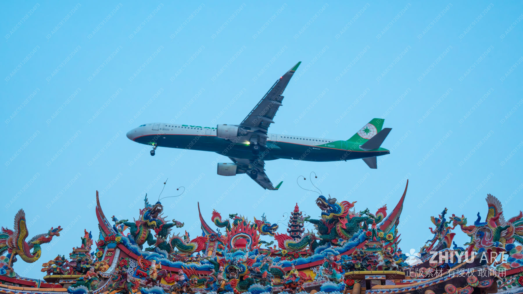 飞机飞越传统寺庙