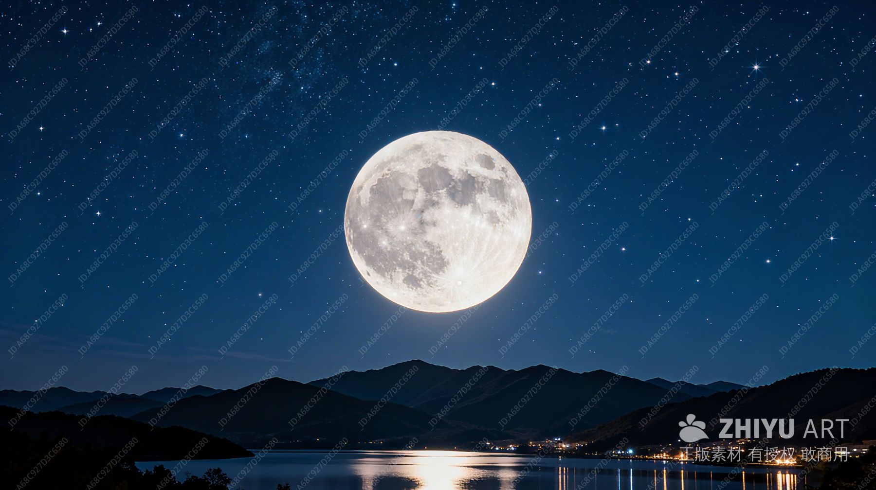 夜空中升起一轮满月,散发着柔和的光芒。星星点缀在夜
