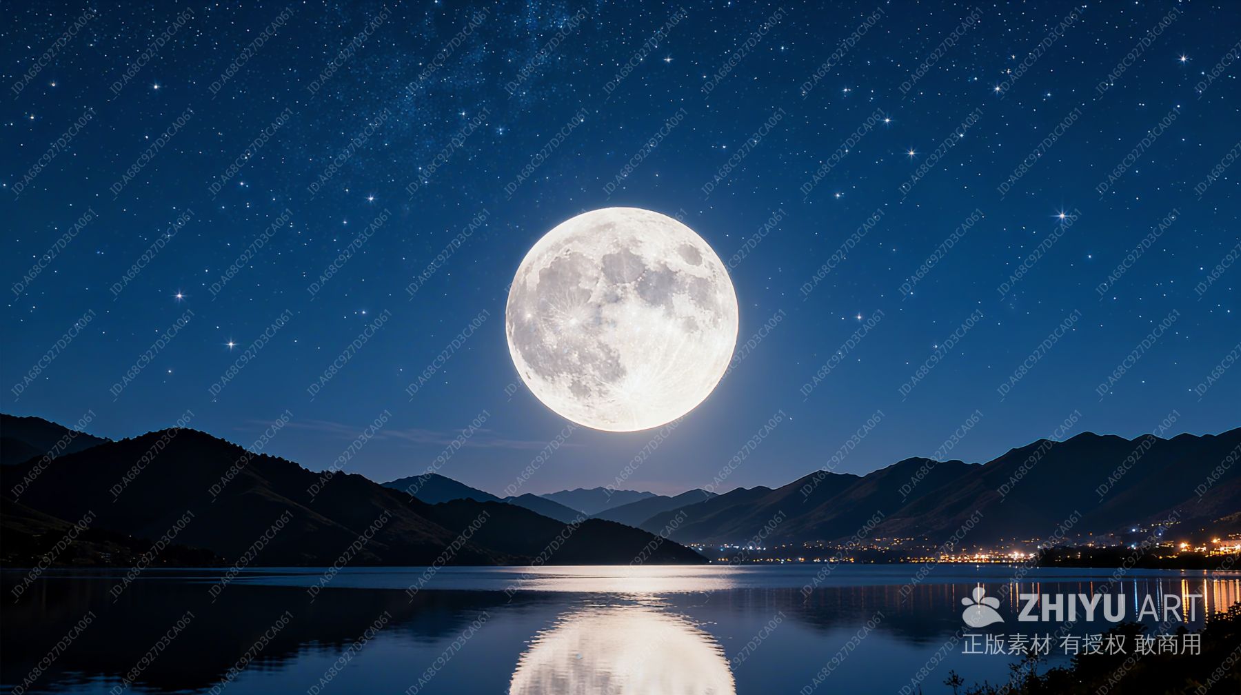 夜空中悬挂着一轮明月,繁星点点。月光洒在湖面上,波