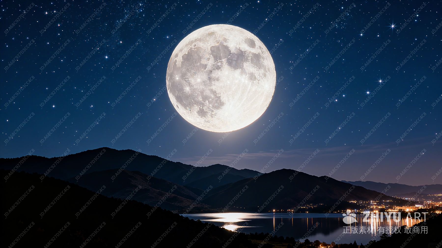 夜空中升起一轮满月,散发着柔和的光芒。星星点缀在夜