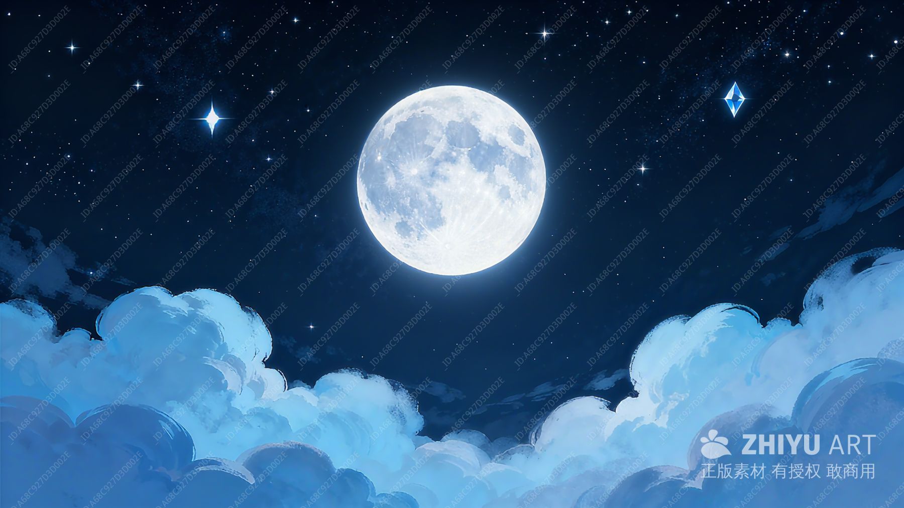 画面中央是一轮皎洁的满月,照亮了漆黑的夜空。夜空中