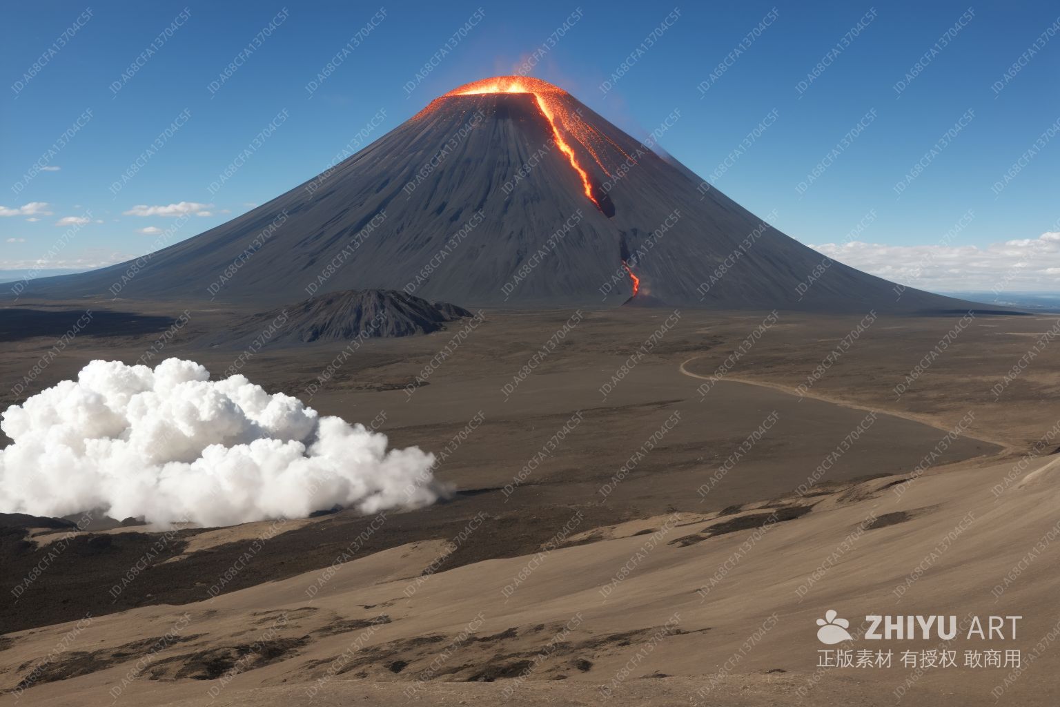 鲜红色的火焰和熔岩,浓厚的烟雾状云彩。远处的山峰和