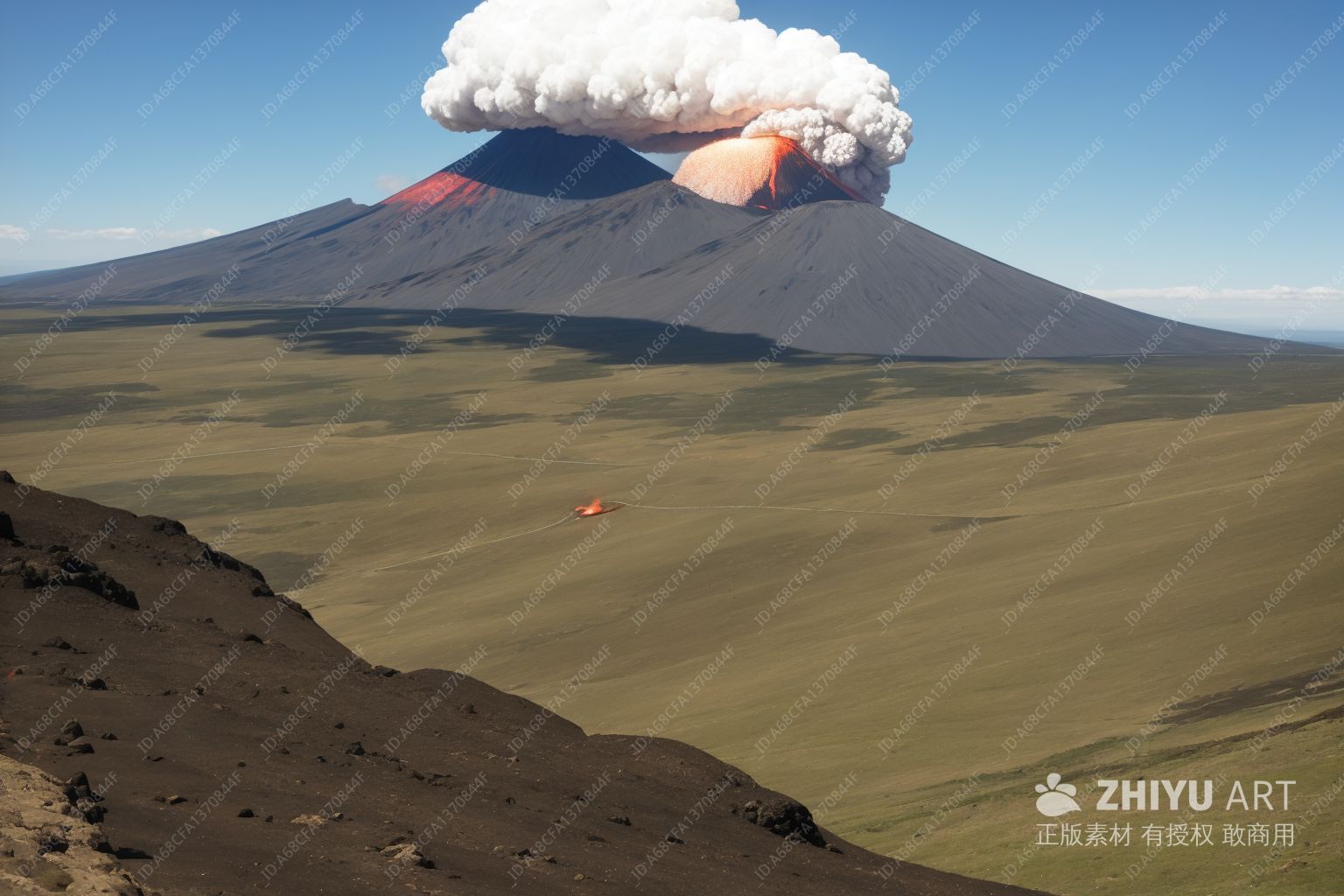鲜红色的火焰和熔岩,浓厚的烟雾状云彩。远处的山峰和