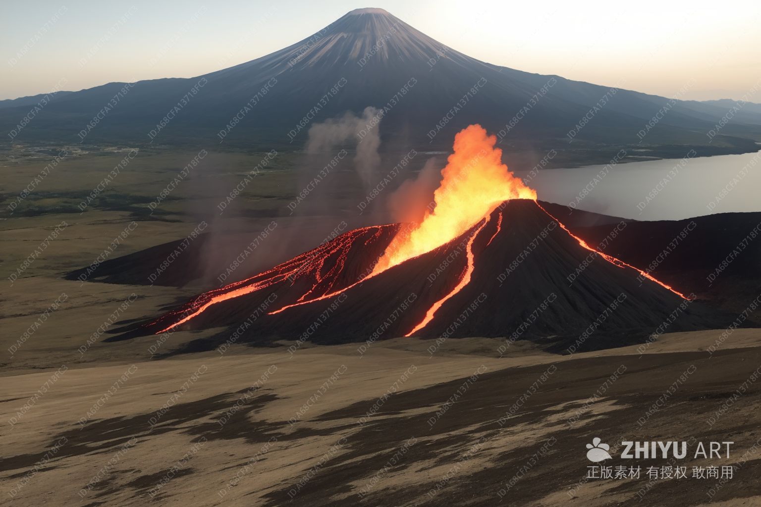 鲜红色的火焰和熔岩,浓厚的烟雾状云彩。远处的山峰和