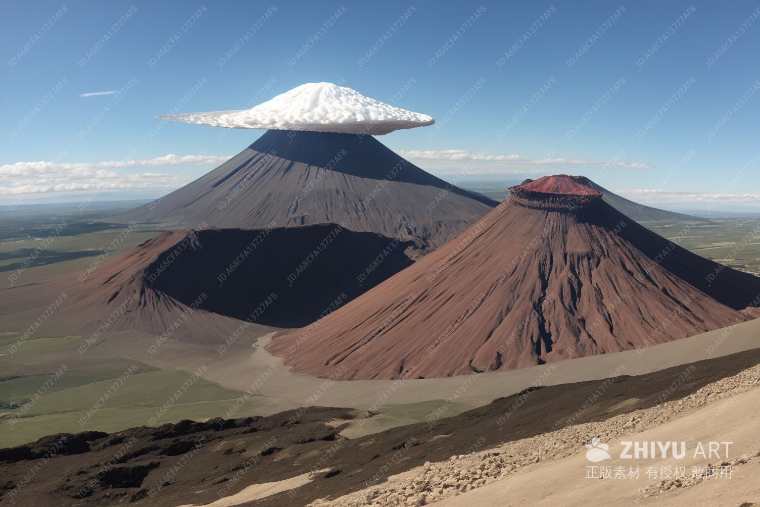 鲜红色的火焰和熔岩,浓厚的烟雾状云彩。远处的山峰和