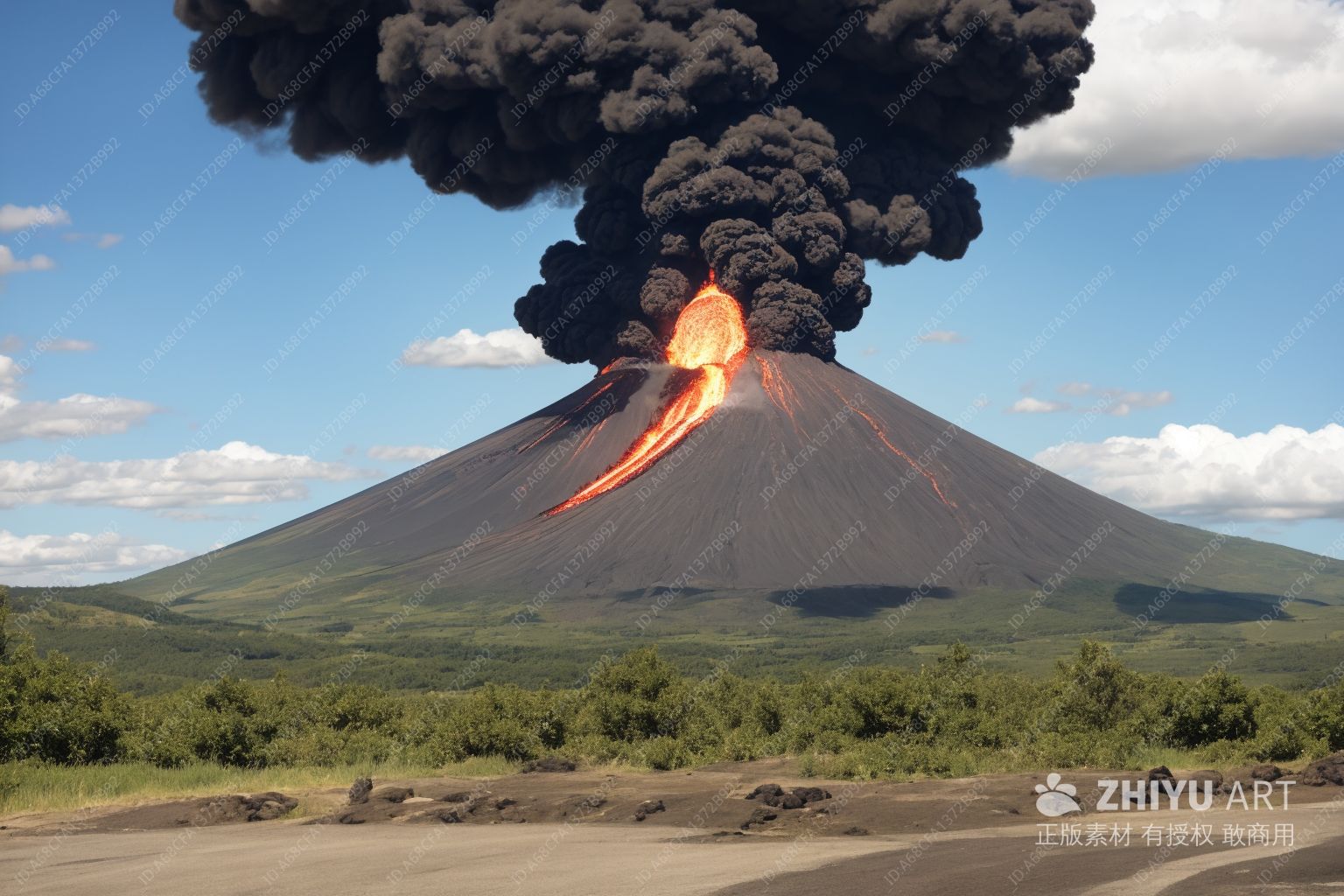 鲜红色的火焰和熔岩,浓厚的烟雾状云彩。远处的山峰和