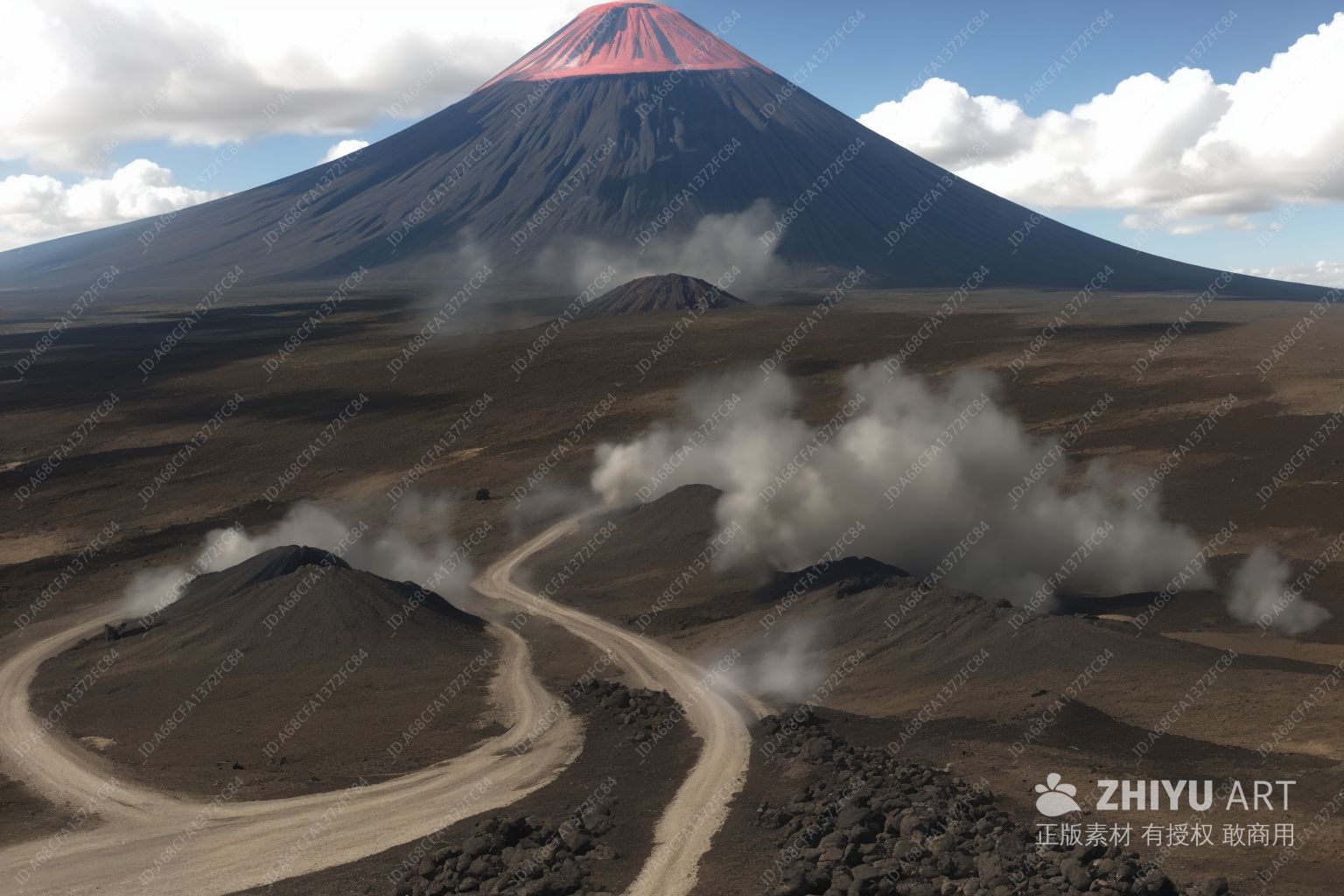 鲜红色的火焰和熔岩,浓厚的烟雾状云彩。远处的山峰和