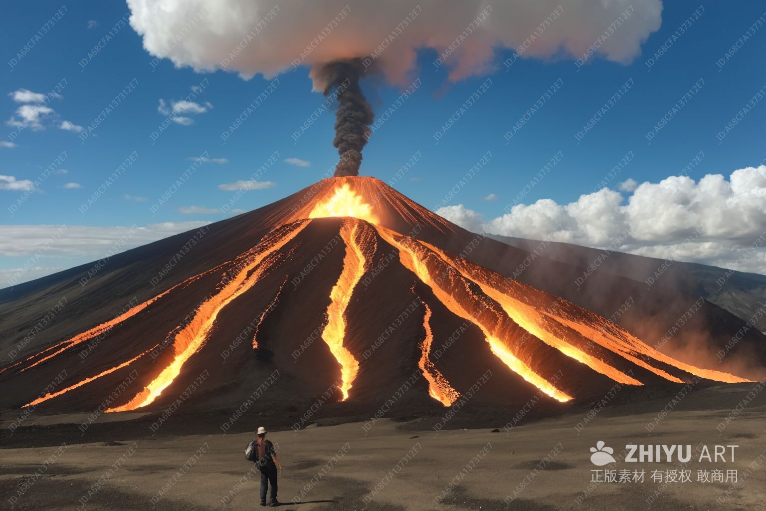 鲜红色的火焰和熔岩,浓厚的烟雾状云彩。远处的山峰和