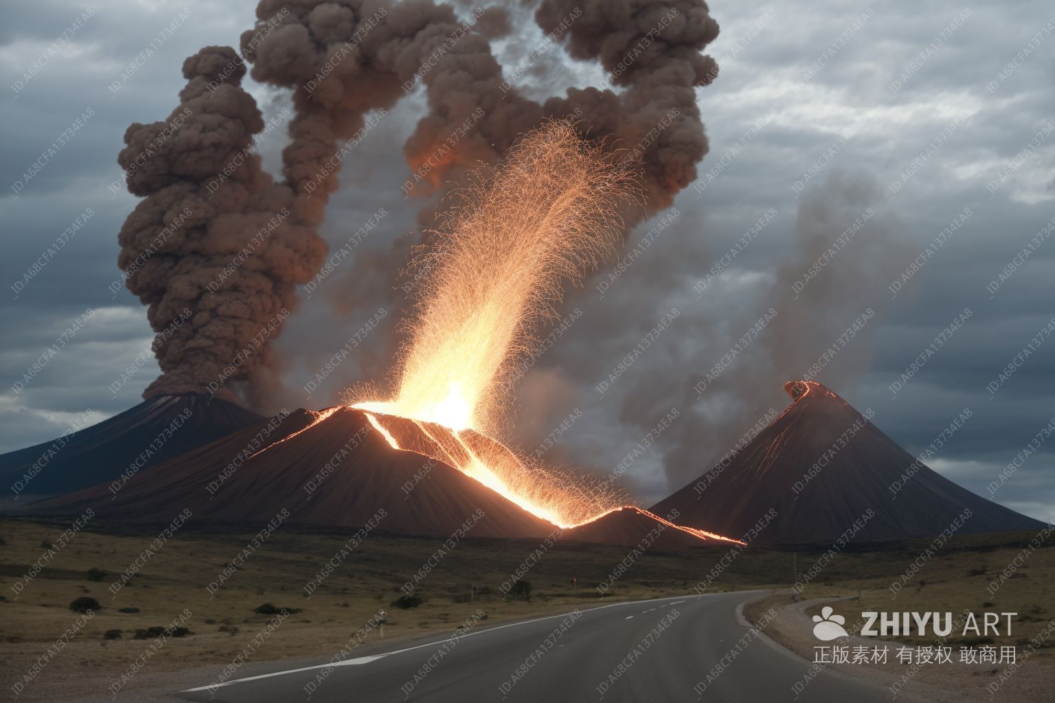 鲜红色的火焰和熔岩,浓厚的烟雾状云彩。远处的山峰和