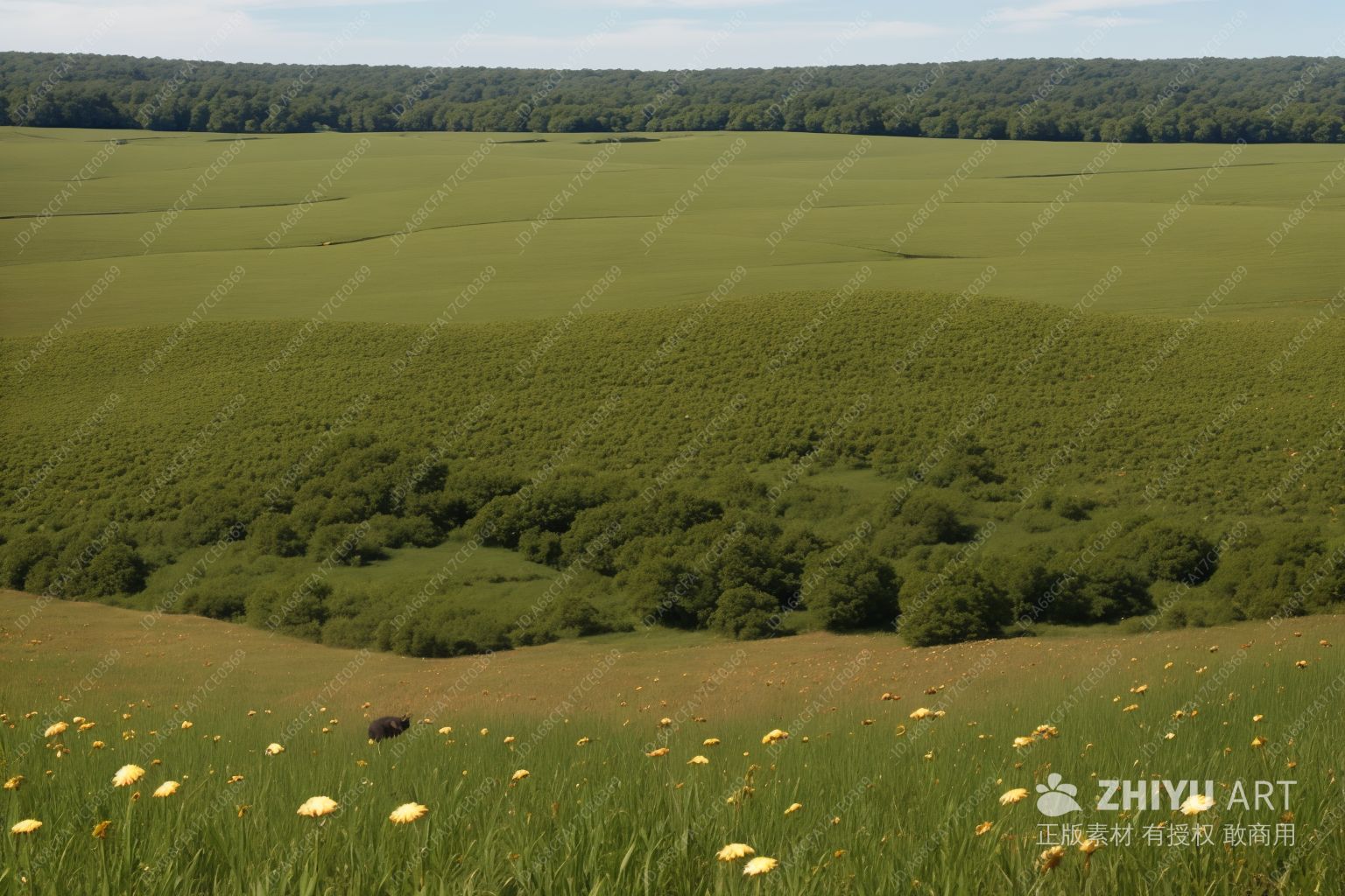 广阔的绿色草地横跨整个画面,舒缓的丘陵和山谷构成一